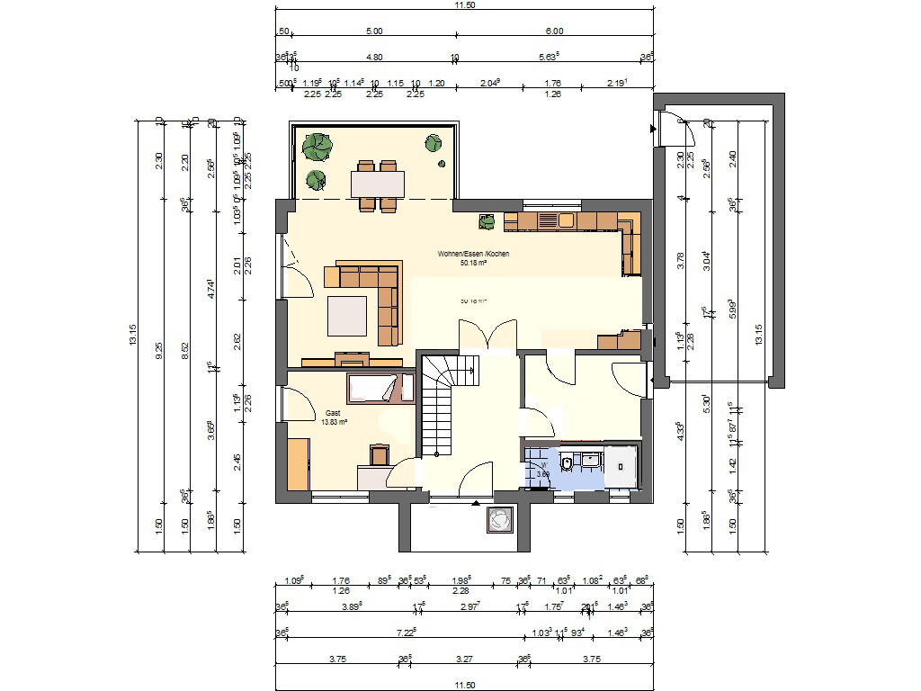 Da ist es doch wirklich egal, ob insgesamt 9 oder 11 Meter Gesamtlänge herausspringt. Wichtig ist, dass die Raumaufteilung großzügig wirkt und auch gut funktioniert.