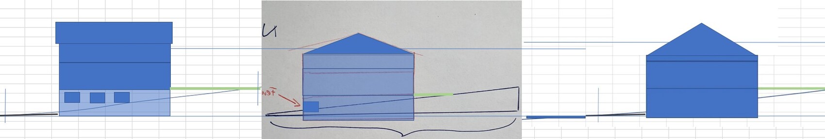 Wenn Du zur Straße noch Fenster realisieren und hinten die Terrasse eben ins Gelände einfügen willst, solltest Du die Treppe zum Eingangspodest nicht unterschätzen. Im skizzierten Beispiel hat sie Pi mal Daumen eine Höhe von 1,70m.