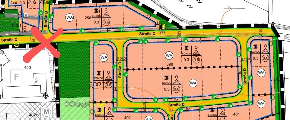Brauchst du dann die Verortung des Fotos im Lageplan noch? Falls ja, ich hänge das nochmal an. Sowohl auf dem Foto als auch auf dem Plan erkennt man die alte Scheune in deren Richtung man guckt.. Das Kreuz ist der Standort. Das Foto ist vom letzten Sommer, vor Erschließung.