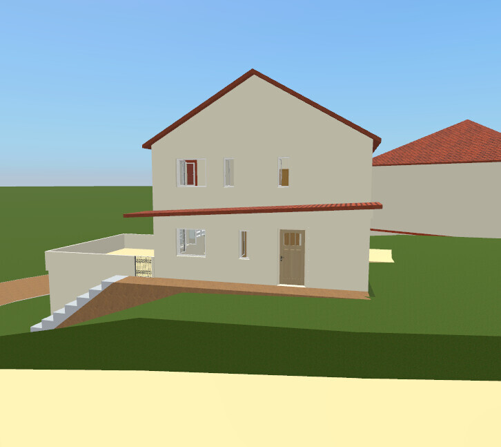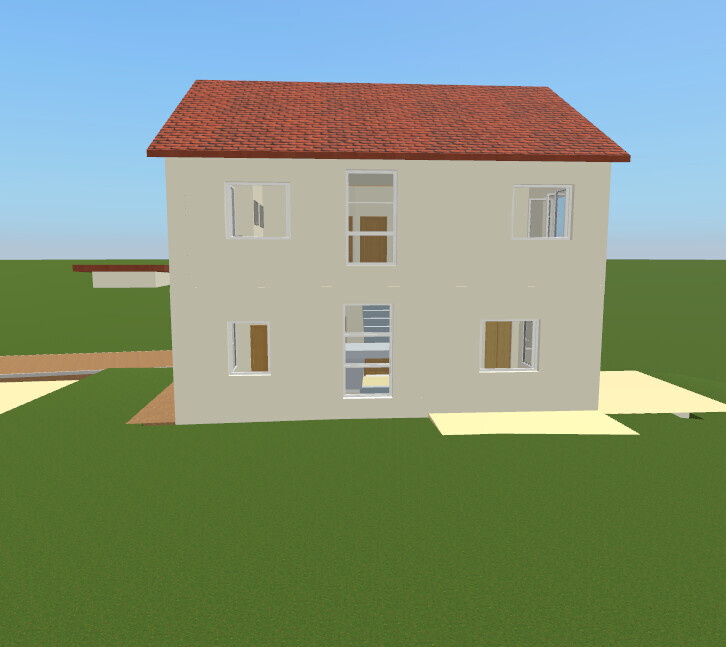 Zweistöckiges 3D-Hausmodell mit rotem Ziegeldach, mehreren Fenstern auf grüner Wiese.
