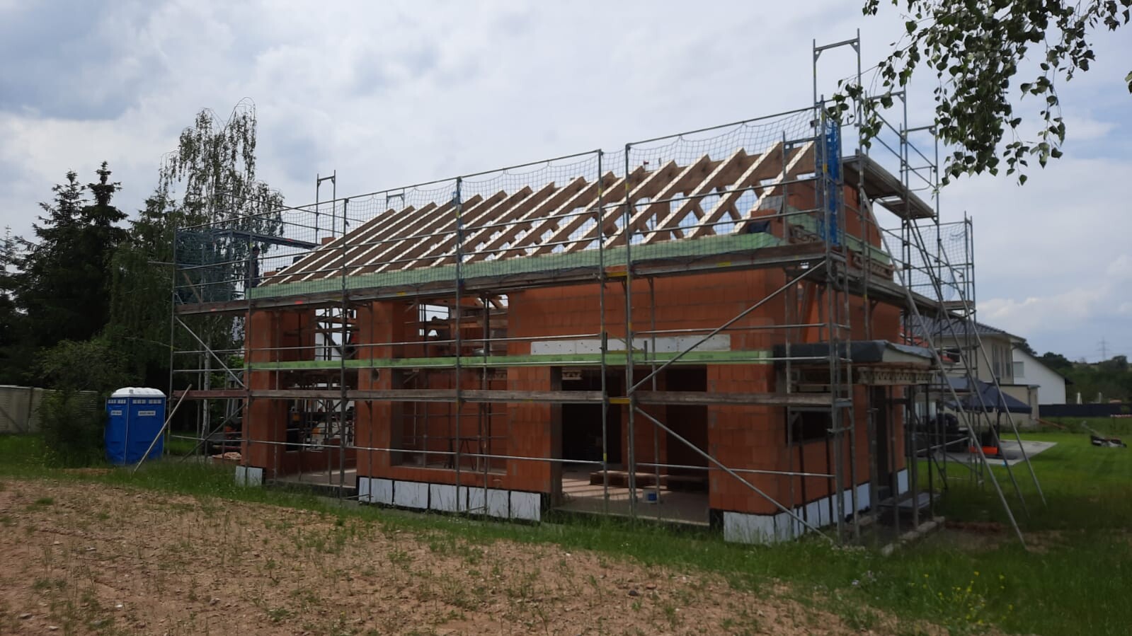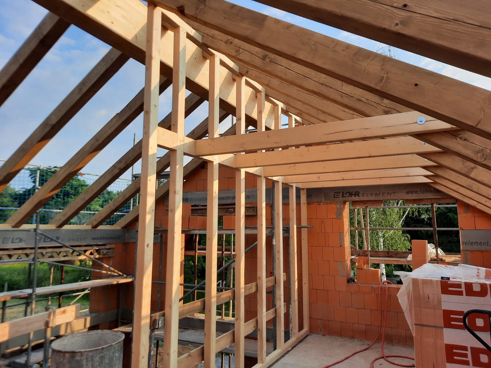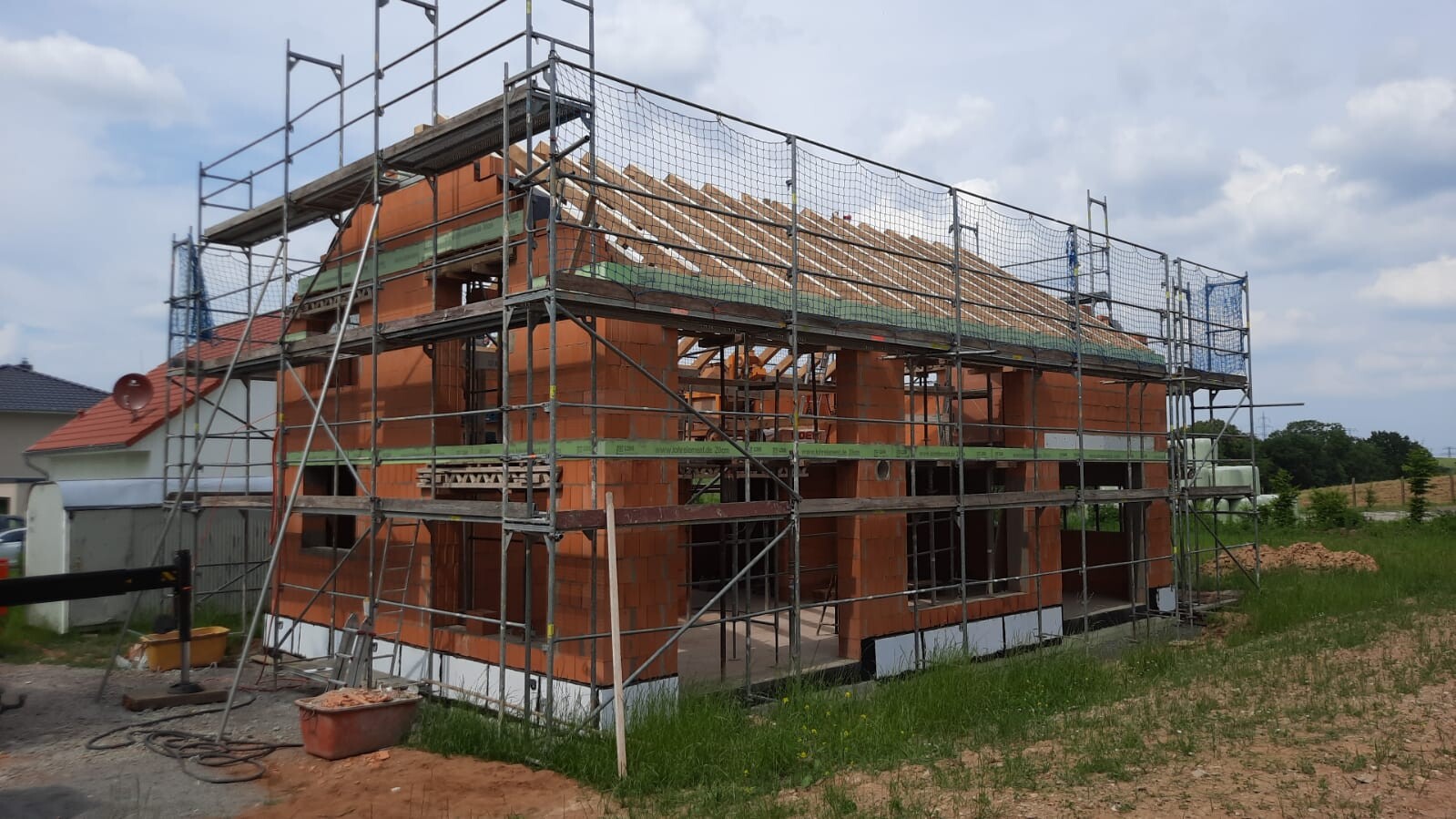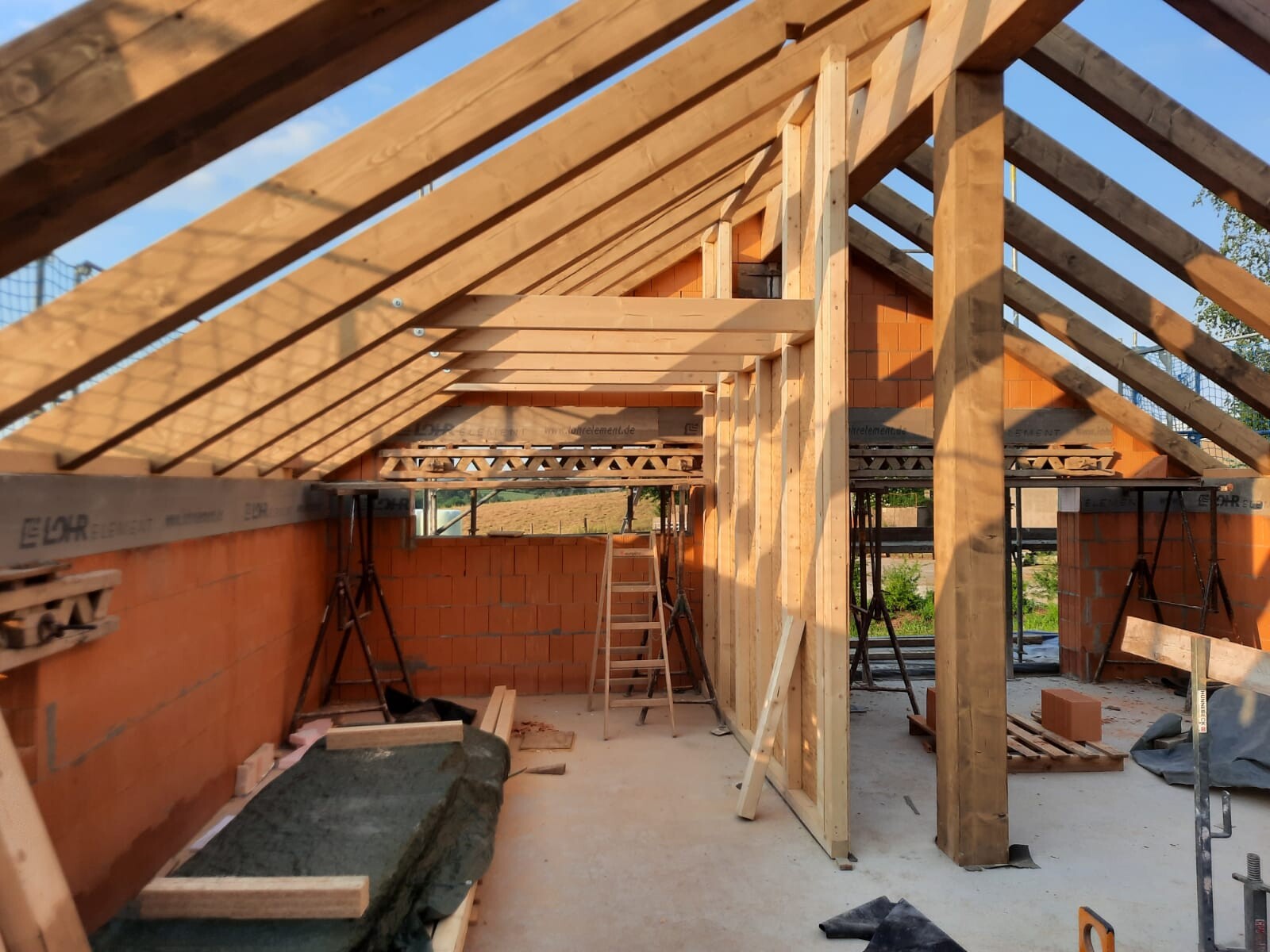 Nun beginnen die Details und das macht Freude. Montag kommt die sichtbare Dachschalung drauf, Dienstag Folie aufs Dach und zeitnah auch Ziegel, einige Tage später dann die Fenster. Der ursprüngliche Grundriss wurde noch etwas verändert, unser GU ist da sehr flexibel und freut sich auch auf unsere Flexibilität auf unserer Seite, wenn bei ihm einmal etwas nicht so passt oder schwierig ist.