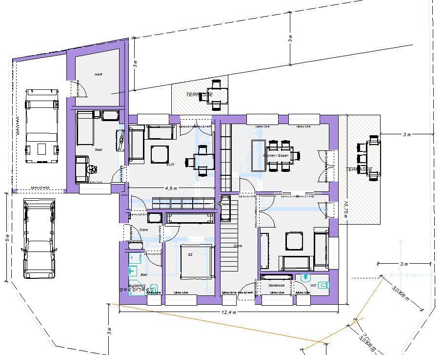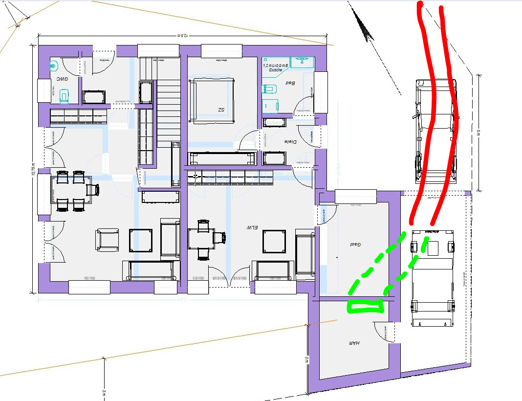 [ATTACH alt="madlen-OG.jpg"]74976[/ATTACH]Vielen lieben Dank für deine Mühe und für diese geänderte Zeichnung unter berücksichtigen der neuen Informationen. Ich habe diese Zeichnung an die Stadtwerke zur Prüfung weitergeleitet (ich hoffe, ich dürfte das). Da der Hauswirtschaftsraum hinter dem Gästezimmer geplant wurde und dieser nur durch die Garage erreichbar ist, bin ich gespannt, was die Stadtwerke hierzu sagen werden.