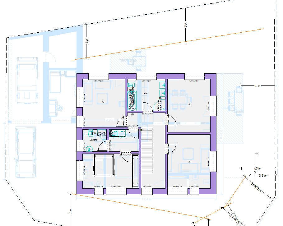 Okay, hier noch ein Vorschlag anhand der neuen Infos. In der Hauptwohnung habe ich eine Podesttreppe gesetzt - imho genauso gut wie eine Gerade. Aber wenn das gar nicht geht, könnt Ihr ja Euren Entwurf wieder hier rein friemeln - dürfte vermutlich auch gehen.