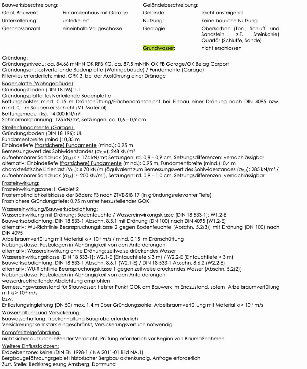 Wie hoch steht denn das Grundwasser an?Zitat aus dem geotechnischen BerichtBeim Bohrvorgang wurde keine Stau-, Schichten- oder Grundwasser angetroffen. Eine Einwirkung von Grundwasser auf das Bauwerk ist nicht zu erwarten. Nach Starniederschlägen und/oder entsprechend nassen Witterungsperioden muss jedoch mit einem verstärkten Auftreten von Stauwasser sowie mit einem erhöhten Wasserdargebot aus Tagwässern gerechnet werden.