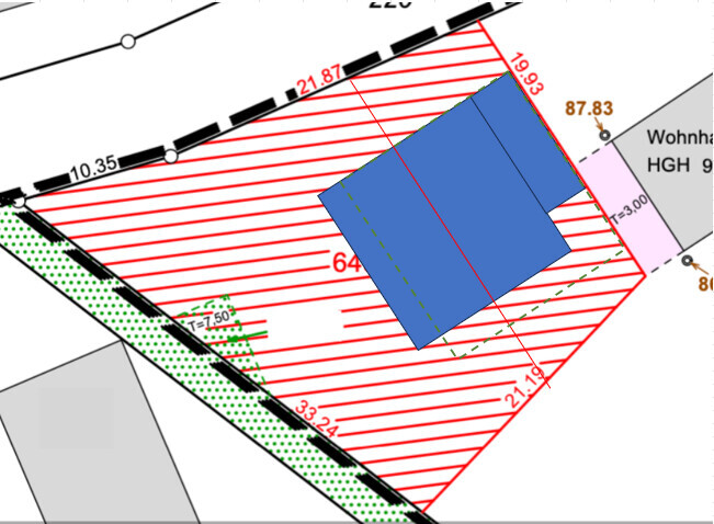 Bauplan: rot schraffierte Grundstücksfläche, blaues schräges Gebäude, grüne Grenzlinien, Maße.