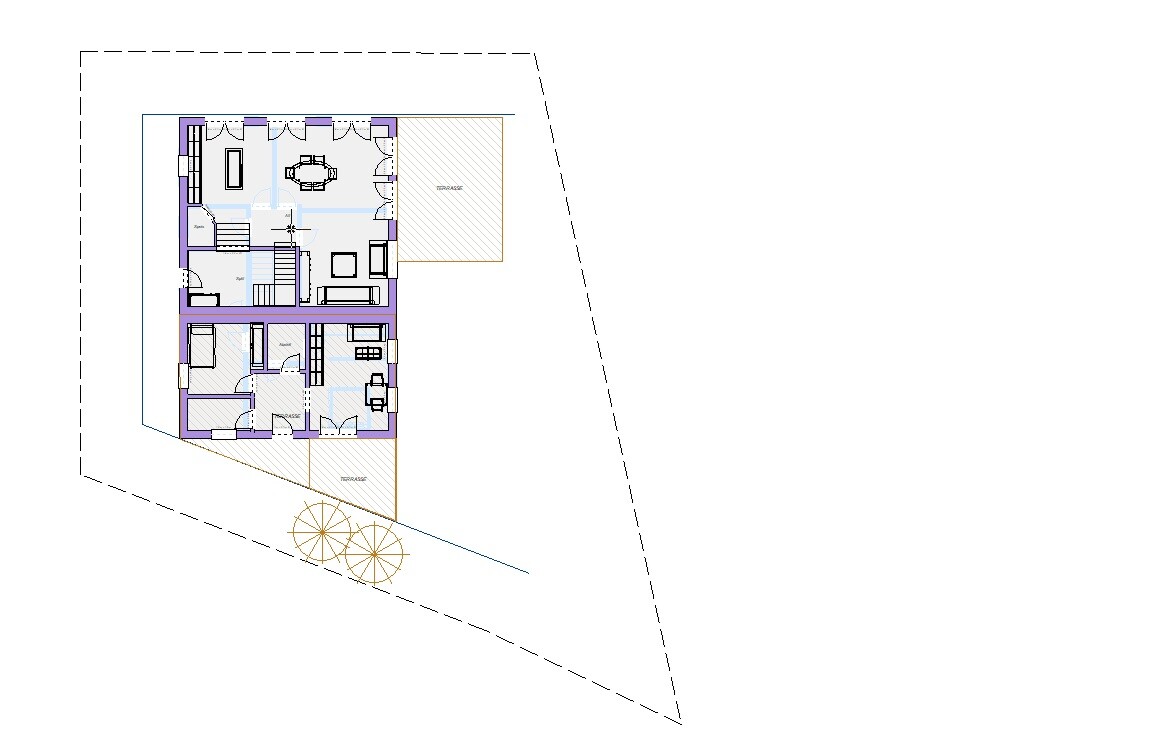 Grundriss eines Hauses mit Wohnzimmer, Essbereich, Terrasse, Garten und Grundstücksgrenze.