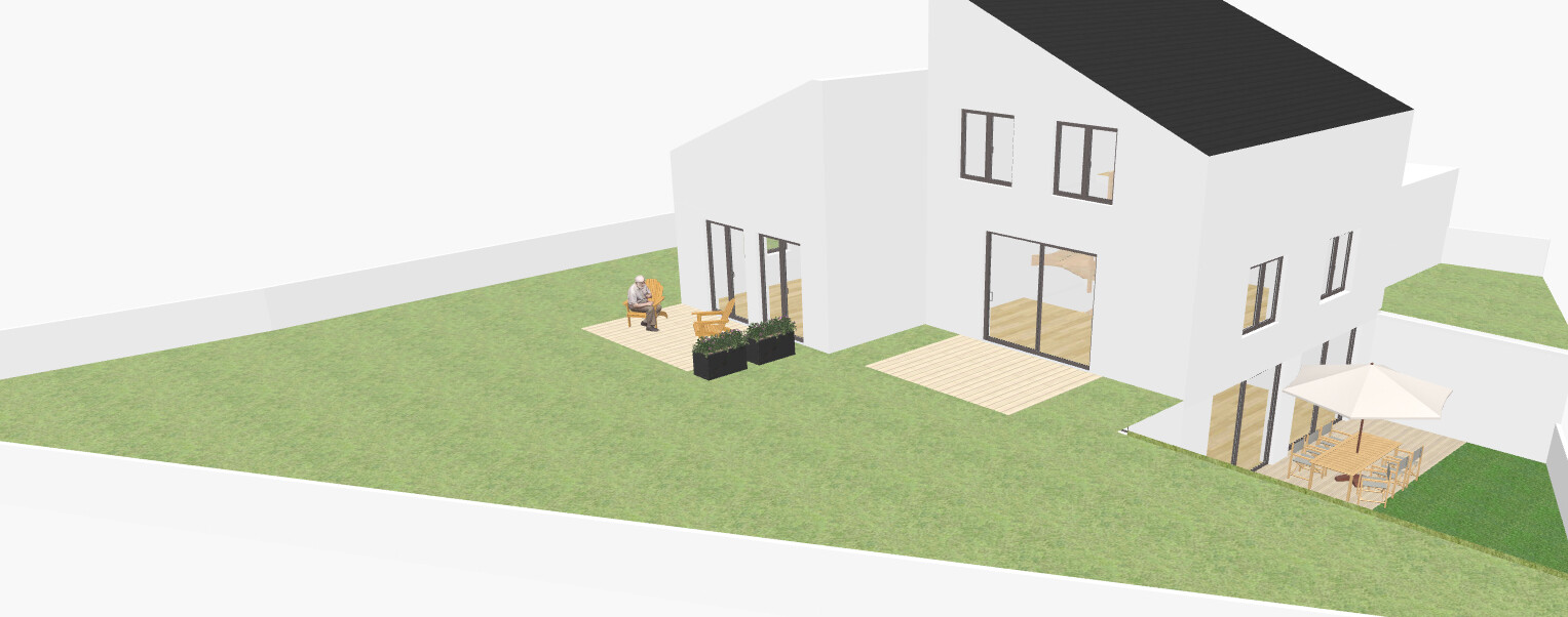 Moderne weiße Villa mit Garten, Holzterrassen, Glasschiebetüren; Person sitzt auf Terrasse.