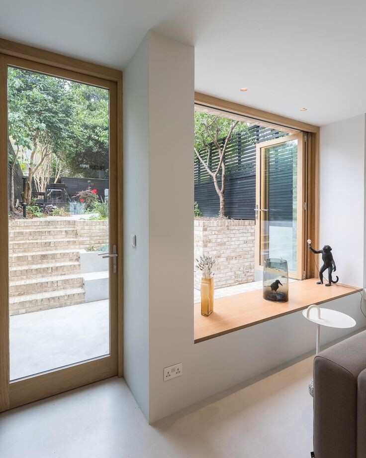 Helles modernes Wohnzimmer mit bodentiefen Glas-Türen zum Garten und Fensterbank-Dekoration.