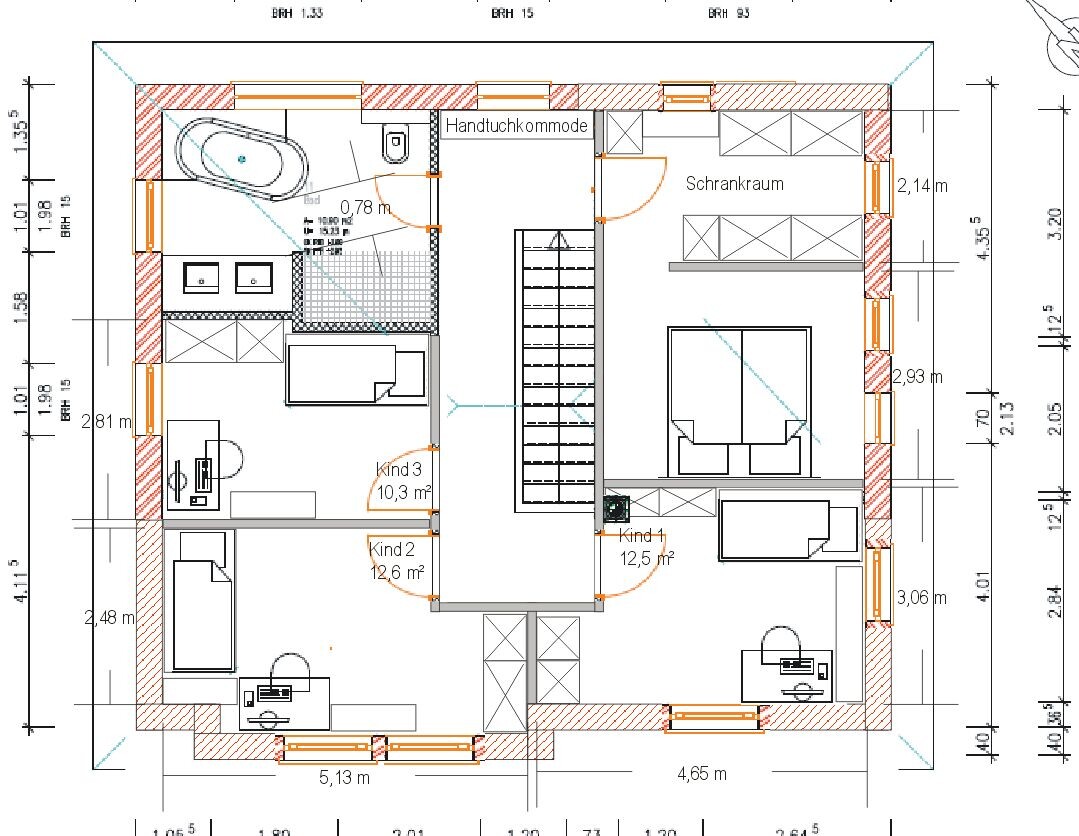 betten auf knapp 210 cm verlängert, Jugendbetten auf 100 cm verbreitert. Räume angepaßt, den Flur planunten den Kinderzimmern zugeschlagen. Alle Kinderzimmer jetzt so, dass dann später auch mal 140 cm breite Jugendbetten passen 😉.