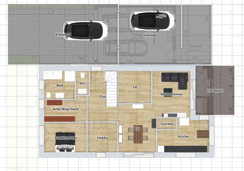 Aus der Doppelgarage wurde eine Einfache. Dafür gibt es eine echte Werkstatt in der Wärmehülle, was im Winter ein Riesenvorteil ist. Die Nord-Ostterrasse musste einer Südostterrasse weichen. Dafür ist sie super groß und überdacht - eine Außenküche bietet sich an.