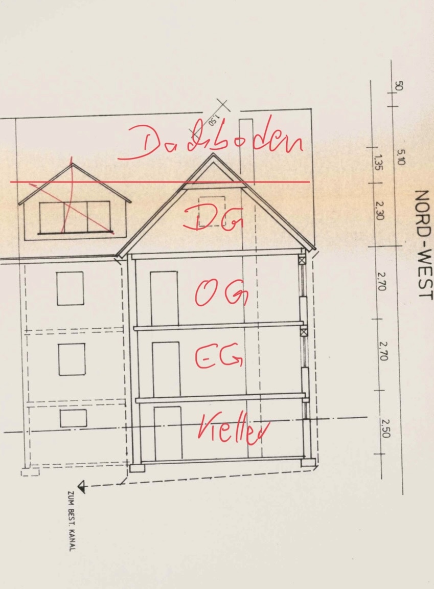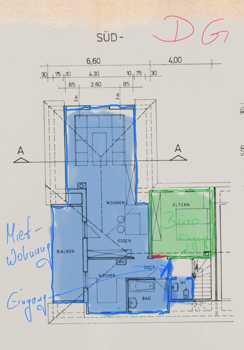 - Im DG wohnt der Mieter. Die Raumaufteilung ist schlecht und historisch entstanden. Daher ist es irgendwann dazugekommen dass das ehemalige Elternzimmer im DG zu einem separaten Raum außerhalb der Mietwohnung geworden ist. Der Zugang zur Mietwohnung von dem Zimmer wurde geschlossen und eine neue Tür errichtet. Es gibt also, wenn man im DG ankommt, drei Türen. Links das WC, geradeaus der Eingang zur Mietwohnung und rechts der Zugang zum Büro.