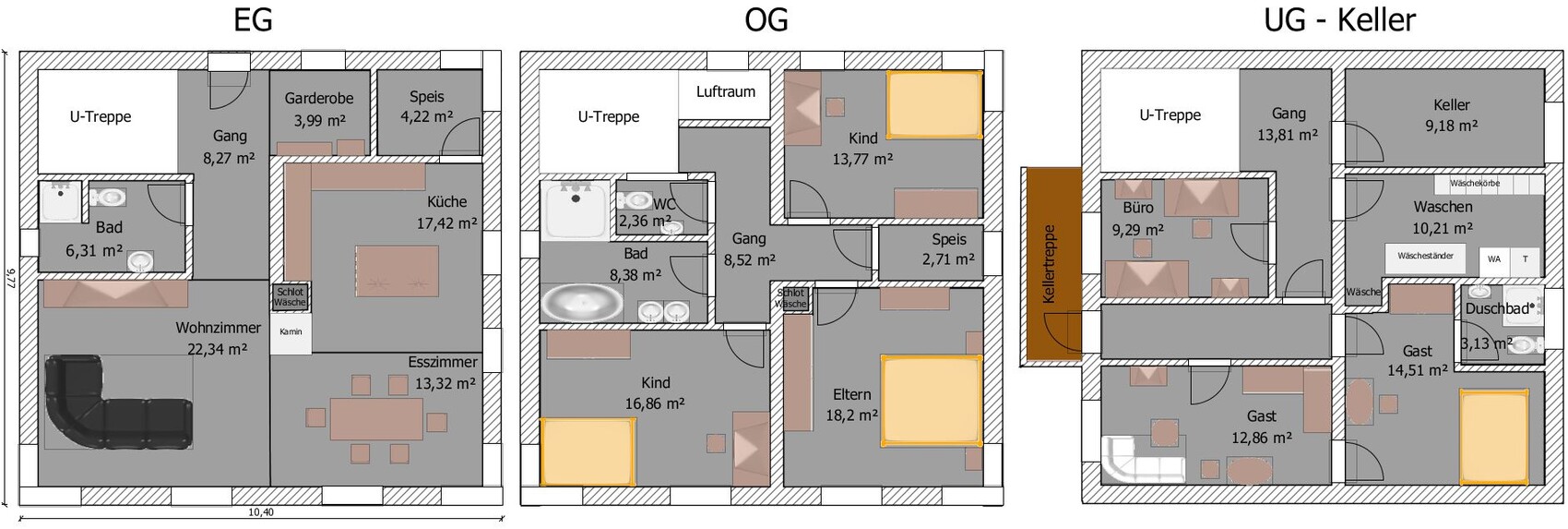 Raumbedarf im EG, OG: 70 - 80 m²