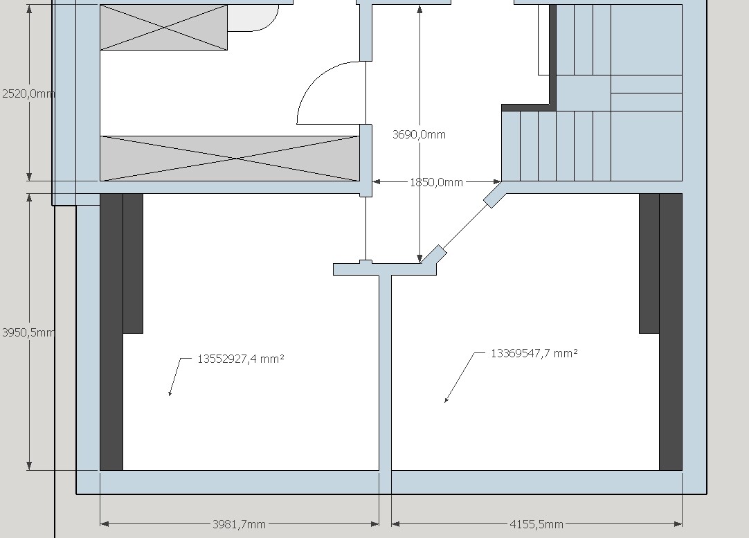 inklusive den Abkofferungen bei den Betten sagt Sketchup eine Restgröße von 13,55m² und 13,36m², reine Grundfläche ohne Schrank und ähnliches.
