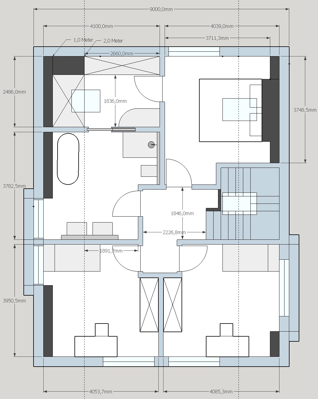 Was mir noch nicht so 100% gefällt ist, dass man an einem waschbecken womöglich aufpassen muss wegen der dahinter liegenden Dachschräge. Laut Sketchup ist die Dachschräge, gemessen zentral hinter dem einen Waschbecken, 1,76m -> ich bin 1,72m "groß", meine Freundin 1,60m.