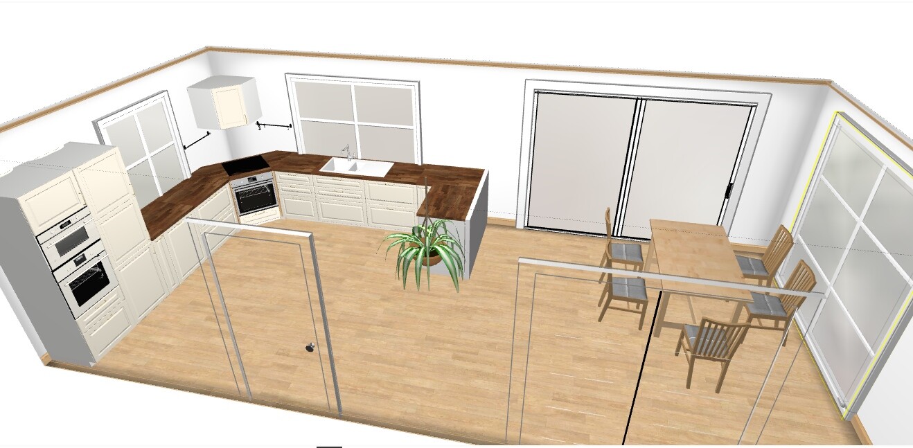 Eine Planung der Küche haben wir auch angehangen, da wir selbst gespannt waren, ob das so funktionieren wird. Die Küchenoberfläche soll bis in die Fenster gehen und die Fenster sollen einen Kämpfer (Festverglasung) an der Unterseite bekommen, damit man das Fenster auch auf machen kann, ohne vorher sämtlichen Kleinkram von der Arbeitsfläche räumen zu müssen.