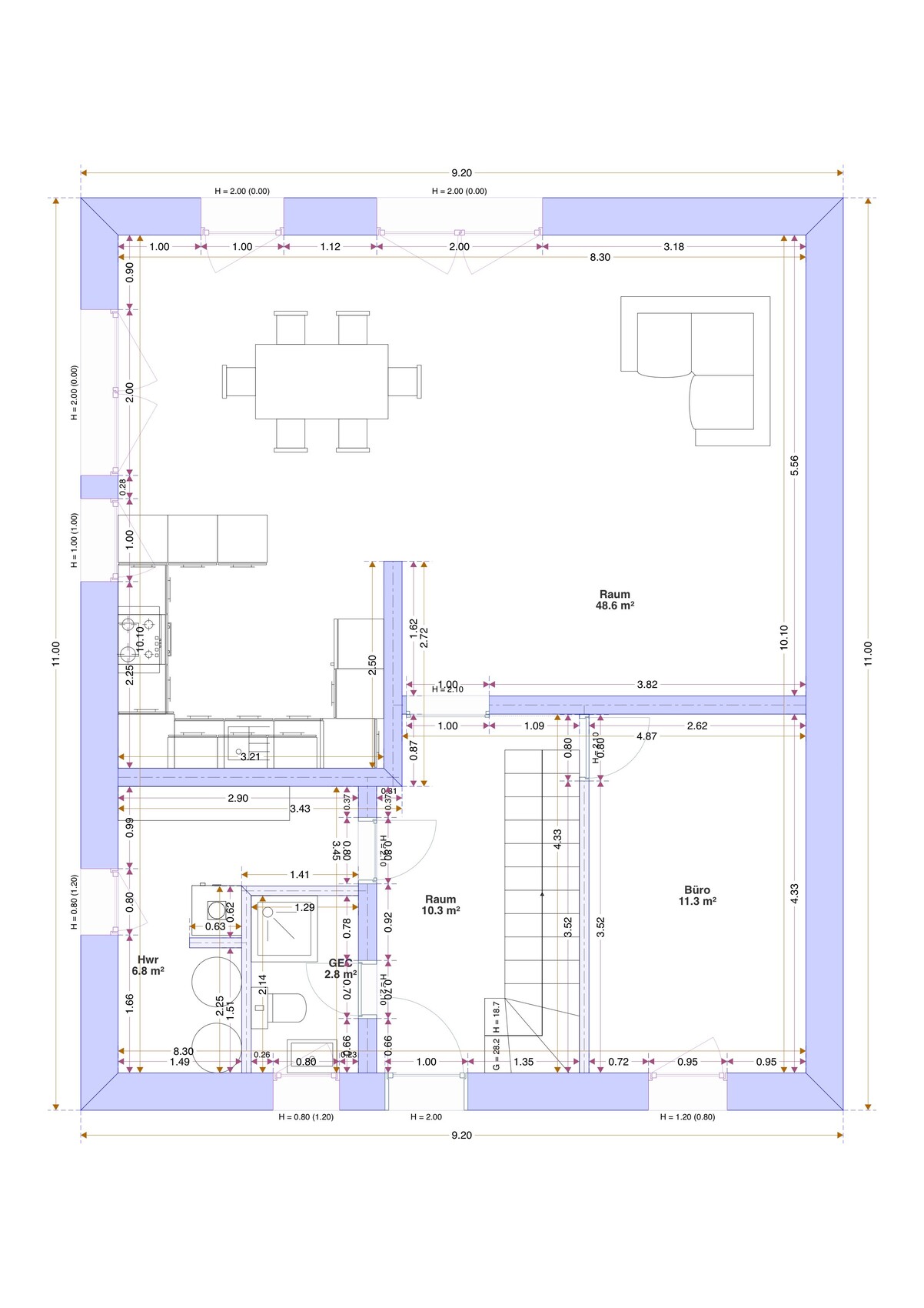 Ja, eine grobe Skizze wäre besser gewesen, die genaue Bemaßung war da nicht zielführend.Mehr noch: kontraproduktiv. So lange man im Stadium des "wilden" Herumprobierens ist, sollte man nicht mit Medien arbeiten, die jedes Detail automatisch vermaßen. Sondern mit Skizzen, an die man dann - sobald die grundsätzliche Anordnung zufriedenstellend ist - sukzessive Maße dranschreibt, in der Reihenfolge ihres Ranges. D.h. zuerst Maße die einem wichtig sind (wo die geliebte geerbte Kommode hinpassen muß) und Maße die diktatorisch sind (von Treppenläufen zum Beispiel), und zuletzt Maße die sich aus Restsummen ergeben.