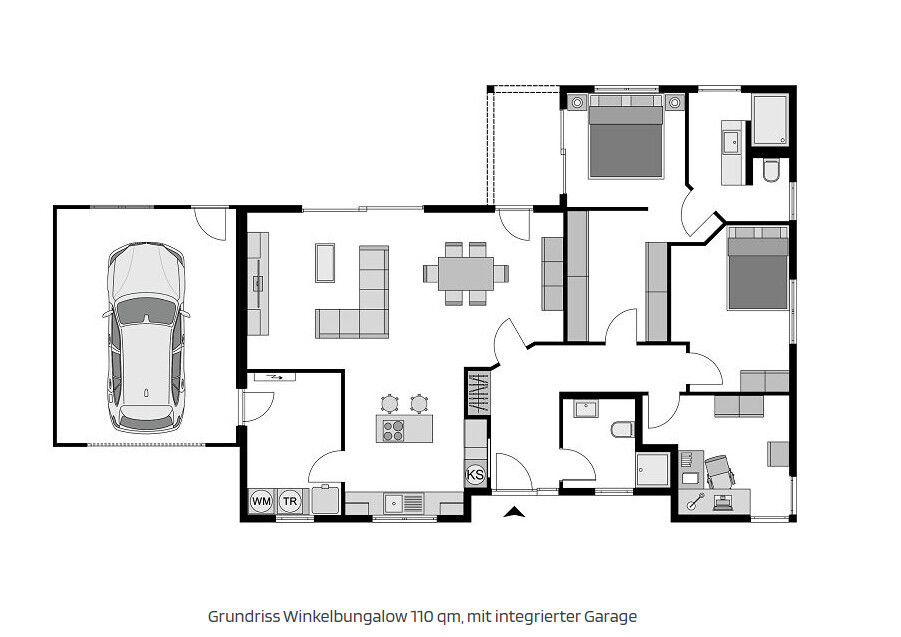 Vorschläge für Bungalows findest Du bei jedem Hausanbieter zuhauf. Gerade Winkelbungalows bieten dabei gute Planungsmöglichkeiten.
