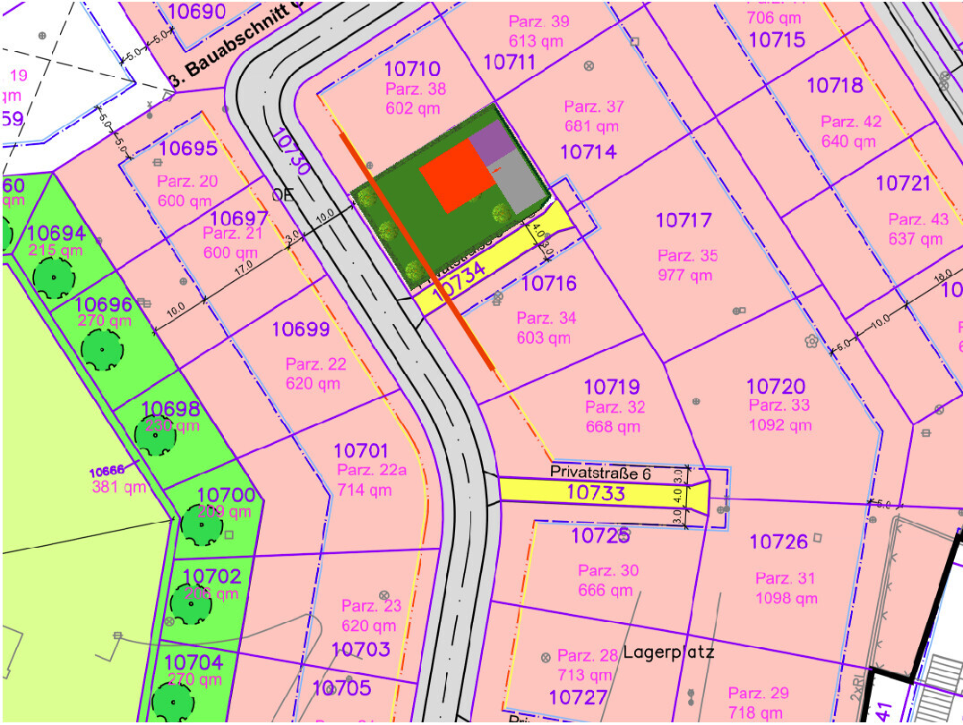 Lageplan: pinke Parzellen mit Nummern, grüne Fläche links, kurvige Straße, rotes Gebäude.