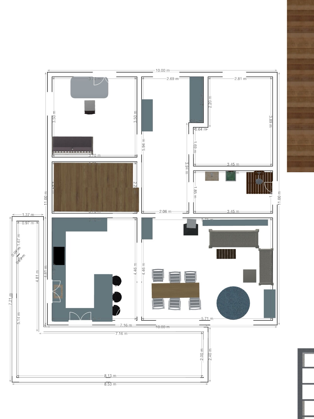 Anbei die neue Variante falls jemand die Muße hat sich das ganze nochmals genauer anzusehen freuen wir uns selbstverständlich nochmal sehr über Feedback. Neue Außenmaße nun ca 10x11, das passt mit dem Baufenster und den Nebengebäuden ohne weiteres.