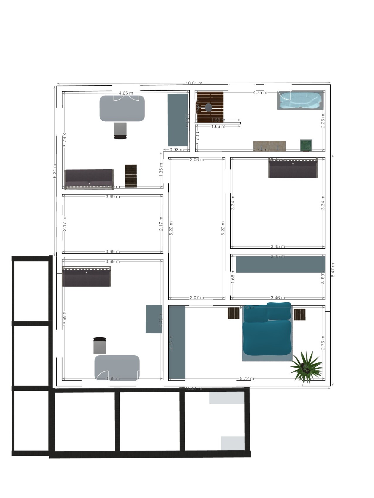 Die eingezeichneten Möbelstücke machen auf mich den Eindruck teilweise nicht Maßstabsgetreu zu sein, sondern etwas kleiner. Beim Möbelkauf auf die Kompaktheit zu achten, um einen Raum nicht zu "erschlagen" wird eine Herausforderung insbesondere im Wohnbereich und in den Kinderzimmern.