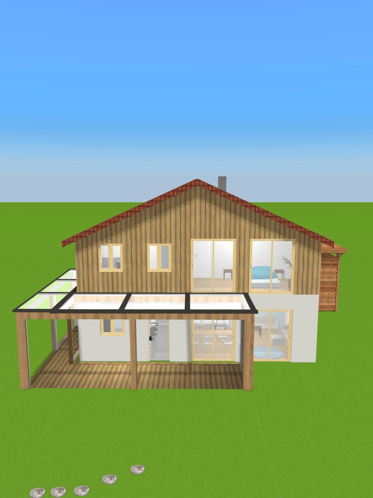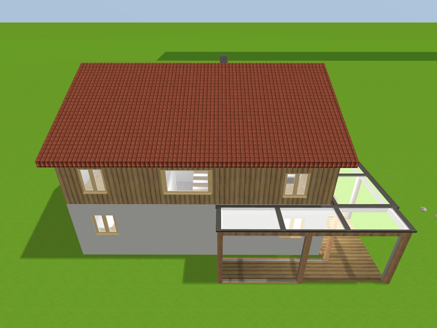 Ich kenne einige Häuser in England, die ein ähnliches Verhältnis von Fläche zu Raumanzahl haben und die Menschen wohnen ausgesprochen gut darin. Ich finde das Selbstbewusstsein gut, sich aus dem "das macht man heute so" herauszuziehen und eigene Gedanken stärker in den Vordergrund zu stellen. Euer Ziel, frei und oft Übernachtungsgäste empfangen zu können, ohne das Haus wesentlich teurer und größer zu machen oder jedes Mal eine Umbauaktion zu starten, bis ein Schlafplatz gefunden ist, erreicht ihr mit dem Entwurf. Die Außenansicht gefällt mir in der Proportion, der optischen Fassadenteilung und dem sinnvollen Bruch in der Symmetrie über Fenster und die überdachte Terrasse/Pergola.