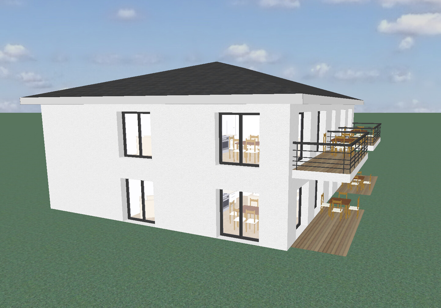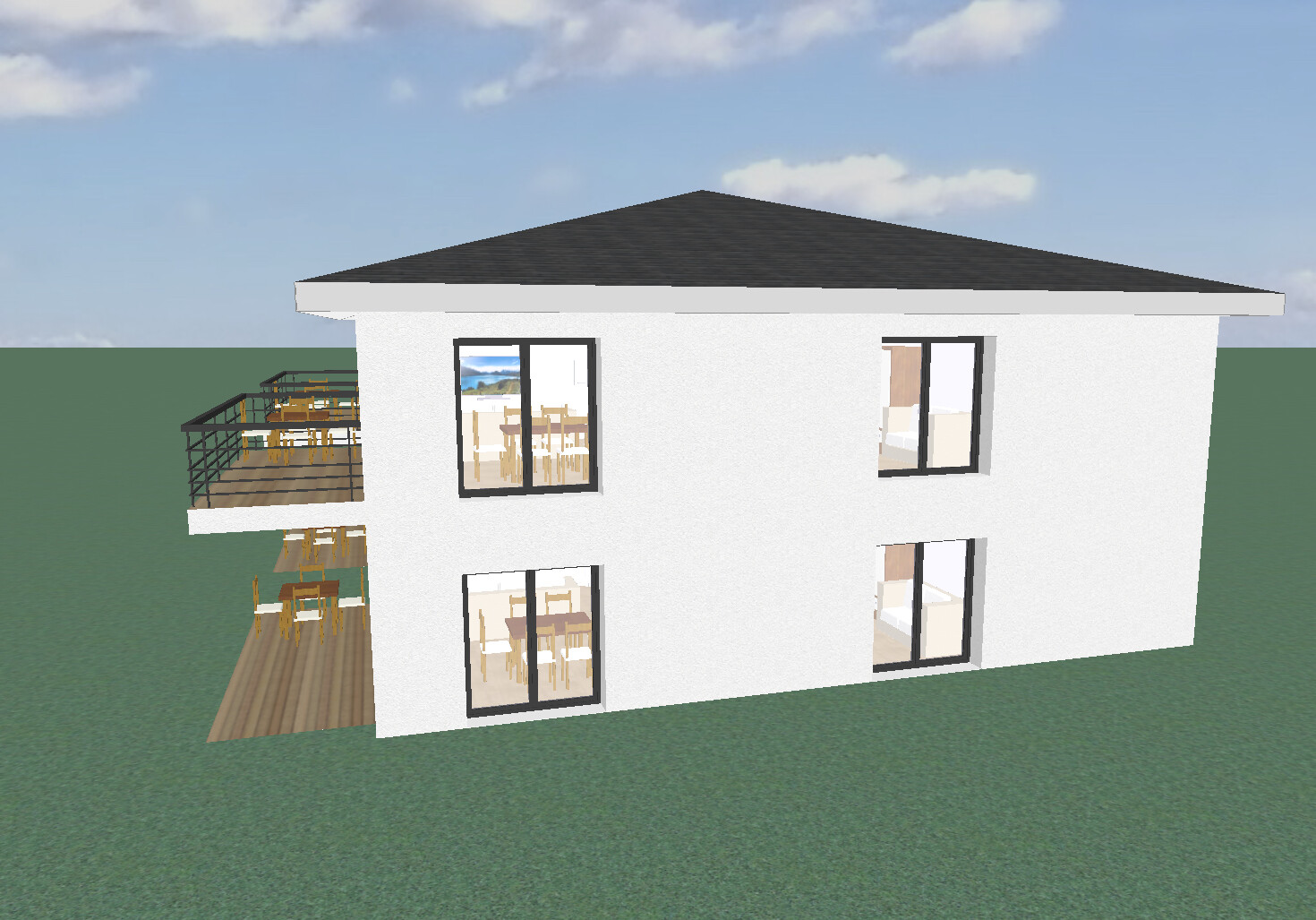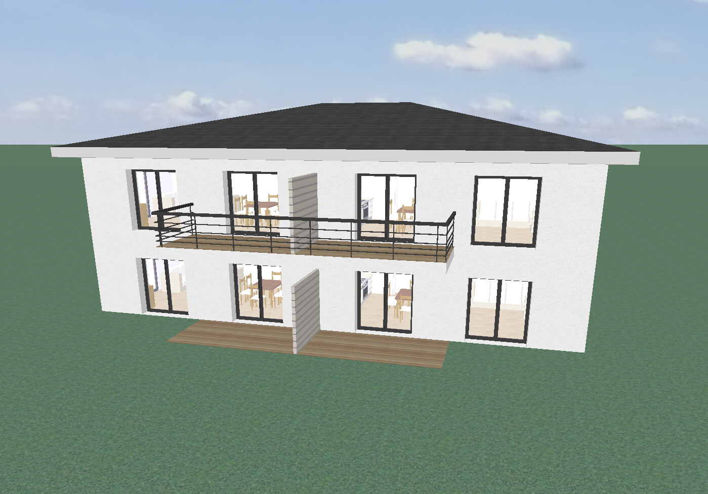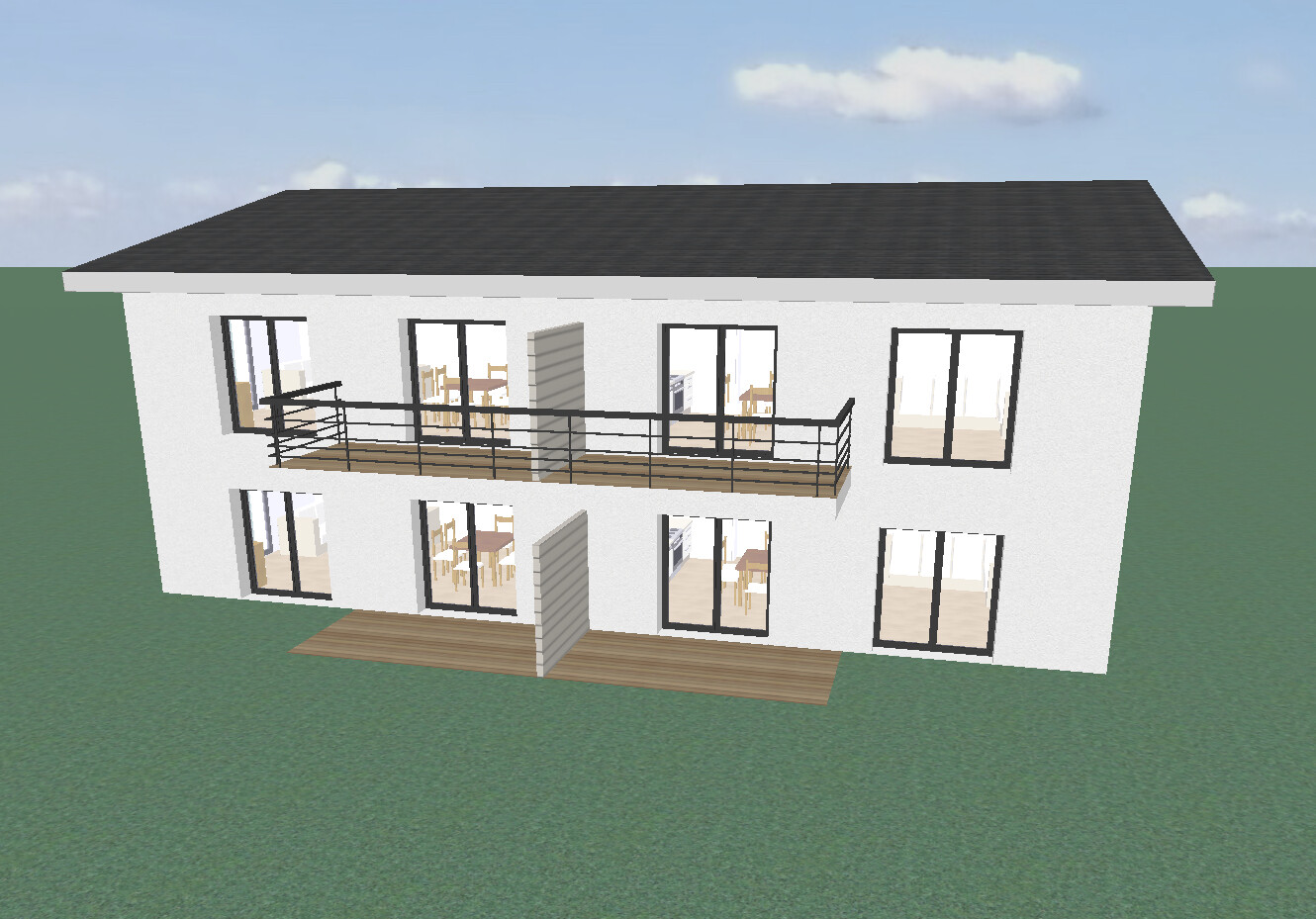 Ich habe hier mal einen Grundriss gezeichnet als Anregung. Im Erdgeschoss eine c.a 74 m2 (inklusive 6m2 Terrasse) große Wohnung mit 3 Zimmern links und rechts eine c.a 84,7 m2 große 4-Zimmer-Wohnung. Im Obergeschoss dann im Prinzip der gleiche Schnitt. Das Gästezimmer in der 4-Zimmer-Wohnung hat dort bloß 2 m2 mehr und noch einen Abstellraum von 4m2 statt des Technikraumes im EG. Hintergrund ist der, dass du bei kleinen kompakten Wohnung mit vielen Zimmern mehr Miete erzielen kannst und diese besser zu vermieten sind (gerade bei hohen Mietpreisen pro Quadratmeter). Das 4. Zimmer in der rechten Wohnung kannst du natürlich auch weglassen, um mehr Platz für dich zu haben (Dann offene Küche im 4.Zimmer möglich). Und den Keller habe ich aus Kostengründen bewusst weggelassen.