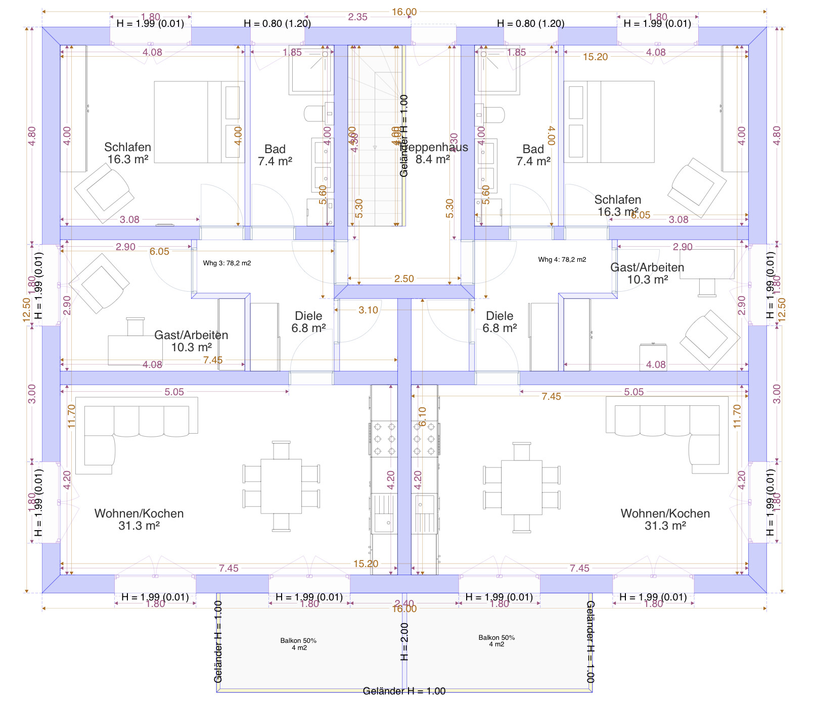 Du hattest ja auch nicht nach einem weiteren Gedanken-Anstoß gefragt, aber ich glaube mehrere Ideen sind immer ganz gut, um den besten Grundriss zu finden. Wenn du sowieso einen Keller bauen möchtest, dann denk dir einfach den Grundriss aus dem 1. OG auch im EG und ja das Gebäude hat die Maße 12,5m x 16m. Und da du anscheinend ein größere Bad möchtest, aber den Grundriss so gut findest. Hier mal die modifizierte Version mit 4 Wohungen à 78,2 m2 (inklusive 8qm Balkon, davon die Hälfte angerechnet). Gefällt es dir so besser?