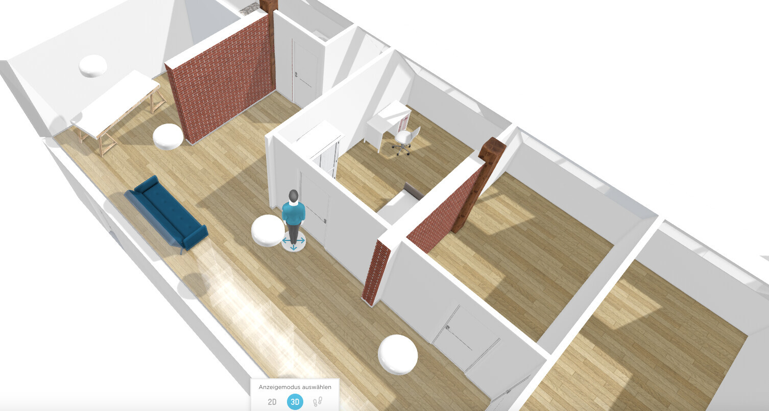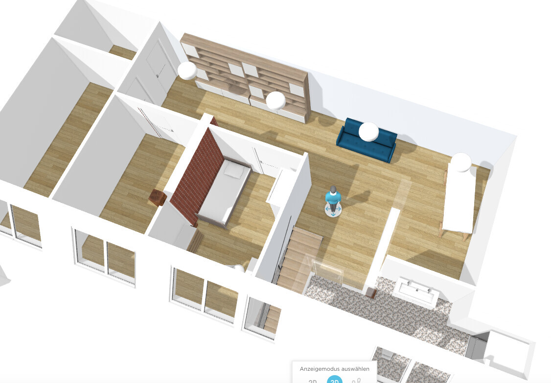 Die Treppe ist auf 4 Meter skaliert. Die kann womöglich kürzer. Dachgauben kann das Programm nicht. Oder ich nicht. Drempel habe ich bei einer 45er Dachneigung auf ein Meter abgekoffert. Man erkennt die 2-Meter-Linie.