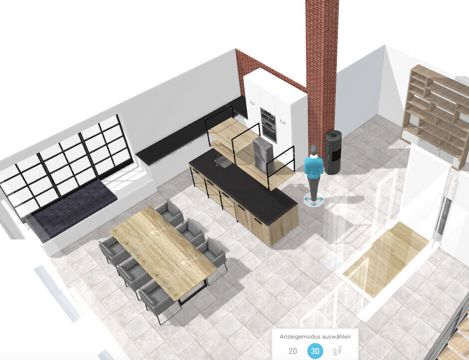 Offene Küche mit Kochinsel, Esstisch und Sitzbank am Fenster; eine Person in Blau steht daneben.