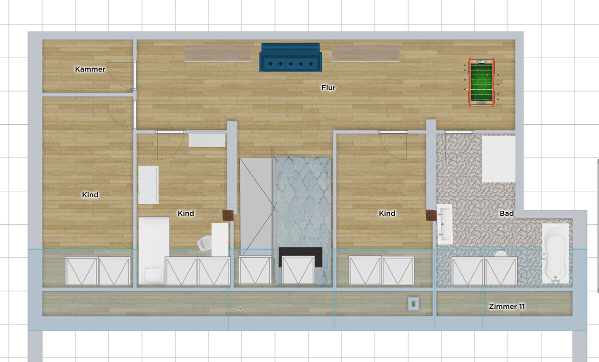 In der goldenen Mitte habe ich in dem rechteckigen Flur eine Chance zur Gemeinschaftsfläche gesehen: Spielen, Toben, Relaxen, Gemeinsam-sein. Der Flur war strukturiert und gab Kommunikationsfläche. Das Verziehen der Räume, sodass sie größer werden, zerstört das.