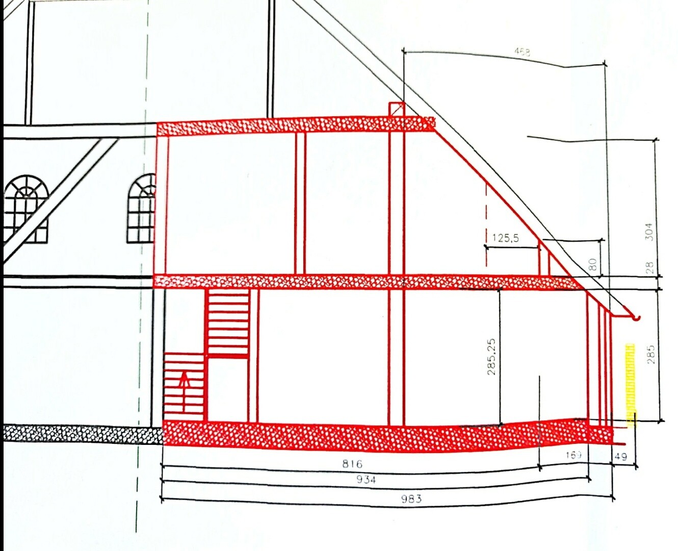Anmerkung: in dieser Zeichnung ist die Stütze (im OG) nicht eingezeichnet.