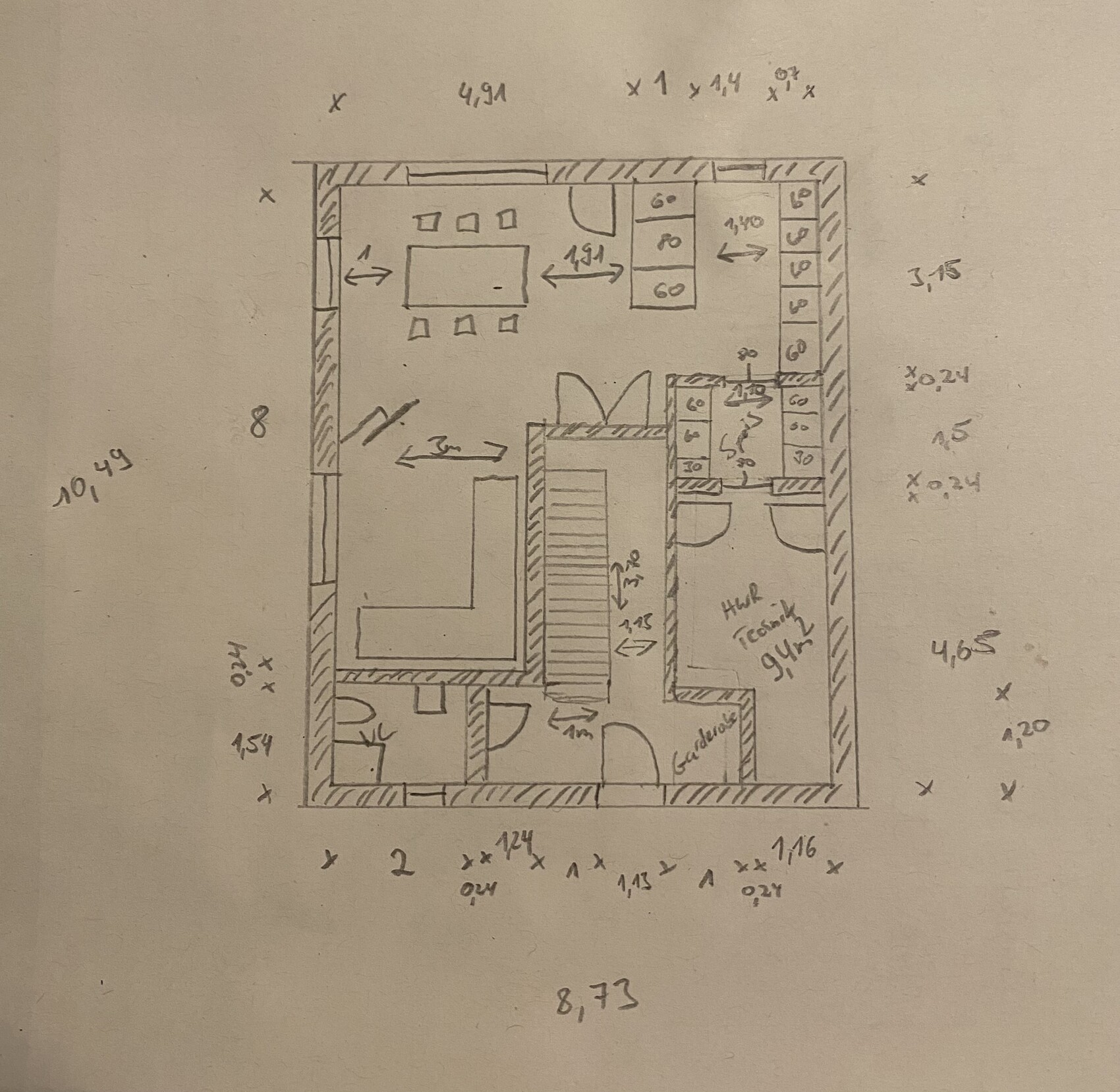 Handgezeichnete Grundriss-Skizze: Innenraum, zentrale Treppe, Wände, Türen, Möbel.