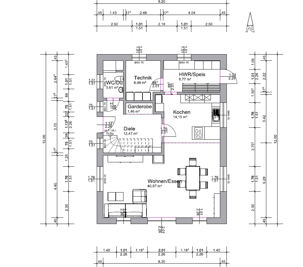 Wir haben noch mal eine kleine Änderung am EG vorgenommen und dann die Schleuse über den Technikraum gemacht. Zumindest für Einkäufe sinnvoll wenn die Garage dort an das Haus anschließt. Allerdings fehlt mir bei der Version noch ein richtiger Garderobenbereich.