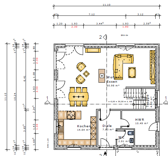 Gedankenspiel wäre noch, die Wand mit dem Ofen 45 Grad abzuschrägen, um die Offenheit zwischen Kochen und Wohnen zu verstärken. Außerdem, eine kleine Garderobe auf dem Wandstück zwischen den Zugängen zu Essen und Kochen zu planen und stattdessen zwischen Treppe und WC einen Abstellraum einzurichten. Und könnte ich mir noch vorstellen, die Haustür einen halben Meter nach innen zu ziehen, um einen geschützten Eingangsbereich zu erhalten.