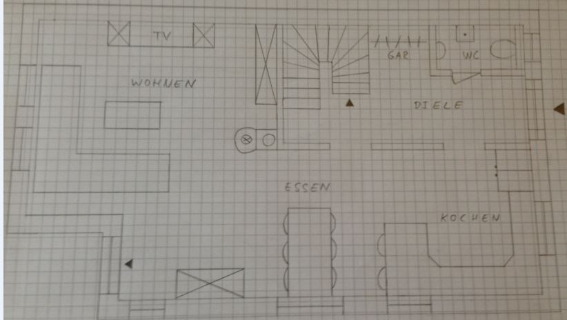 An einer leicht abgewandelten Variante arbeite ich gerade, diese folgt bald. Ich weiß dass die Zeichnungen zu Keller sowie Obergeschoss noch fehlen, diese folgen auch noch. Es soll ein eingeschossiges Haus mit Satteldach entstehen, bei dem der Dachfirst von der Treppe über den Esstisch verläuft (parallel zur Straße, ich weiß da gibts nen Fachbegriff für ). Daraus ergibt sich noch ein Dachstudio über dem OG. Somit ließe sich trotz schmalen Grundrisses durch Keller und Dachstudio genügend Wohn- und Lager-/Hobby-/Partyfläche generieren.