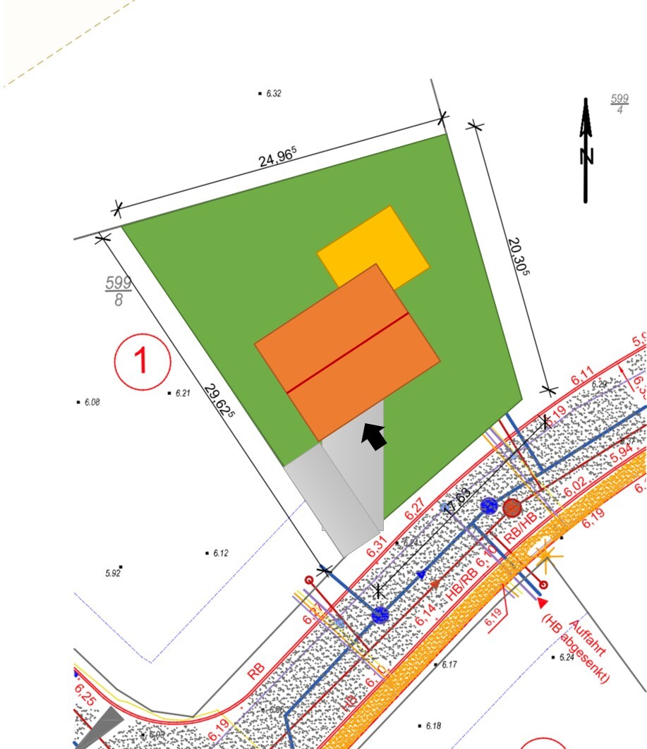 Vielleicht geht das ganze auch mit um 90° gedrehtem Haus. Hätte den Vorteil, dass die Giebelfenster auf der SW Seite nicht direkt auf die Nachbarwand schauen.