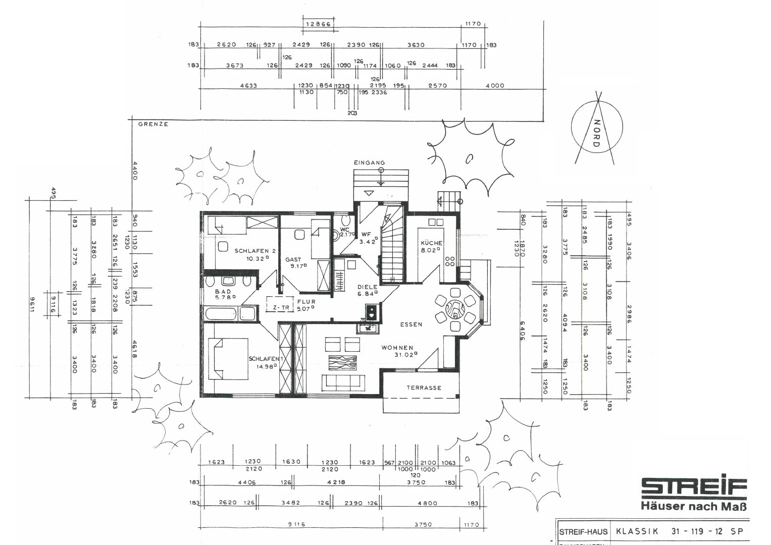 Ausrichtung: siehe Luftaufnahme. Eingang (aktuell): Norden