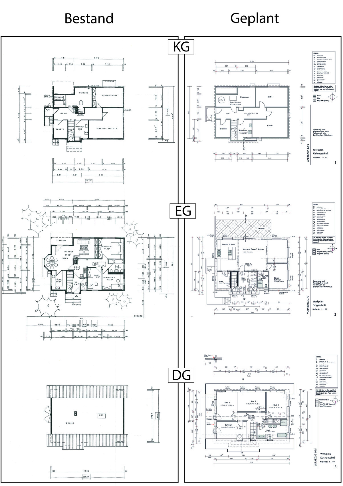 Vorhandene (Bestand) und geplante (Geplant) Gebäudegrundrisse: KG, EG, DG.