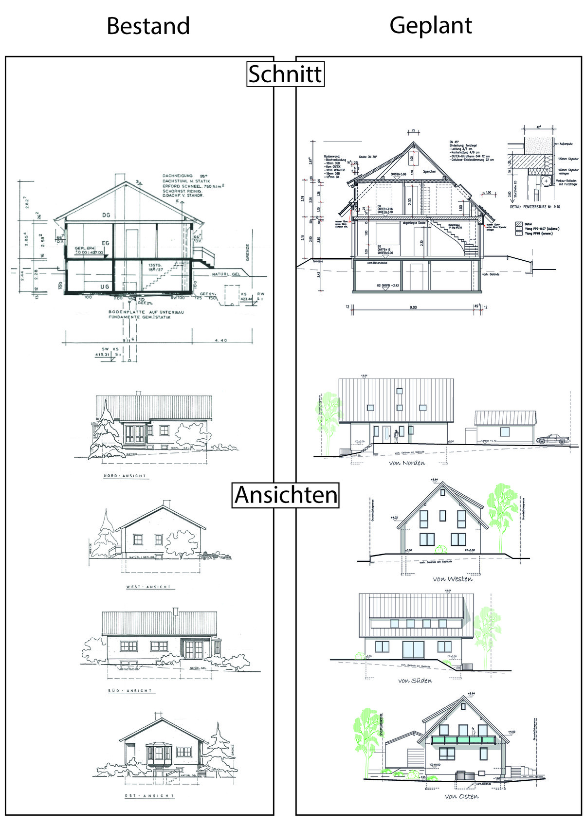 Architekturzeichnung: Bestand und Geplant; Schnitte und Ansichten eines Wohnhauses.