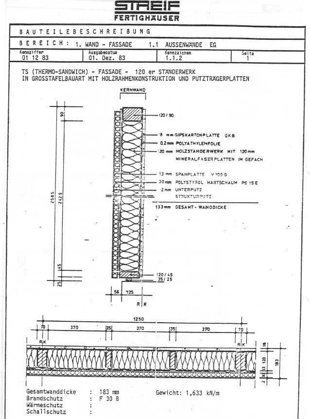 Anbei Auszüge aus der Original Statikberechnung von Streif Haus, bei welchem der Wandaufbau gut dargestellt ist. In dem Bild aus dem Dachgeschoss kann man die Holzständergrößen erahnen. Die Sparren links entsprechen in ihrer Breite im wesentlichen den DG Deckenbalken. Rechts im Bild sieht man die 12cm Außenwandbalken.