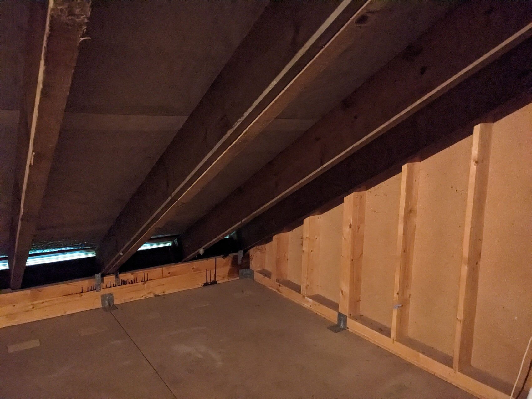 - Feedback der örtlichen Zimmerei nach Begehung: Die Statik der Außenwände und der Geschossdecke zwischen EG und DG wird wohl kritisch für eine Aufstockung. Die verbauten 12cm Holzständer (außen), bzw. 9cm (innen) sind wahrscheinlich zu knapp bemessen für die erwarteten zusätzlichen Lasten. Die Deckenbalken sind mit 6cm Breite wohl auch zu schmal. Das Fertighaus wurde statisch gerade so ausgelegt, dass es als Bungalow funktioniert.
