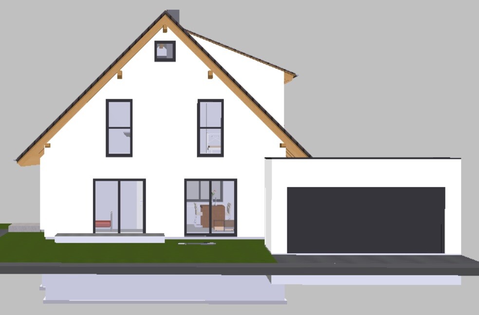 - Das Schleppgaubendach ist mit 22° sehr flach, wir hatten uns hier eher 30° erhofft (Optik und bessere Eignung für Photovoltaik), hier müsste die Anbindung der Gaube an die Kehlbalken verändert werden. Aktuell ist da sehr viel Fassadenfläche zwischen Gaubenfenster und Gaubendachrinne.