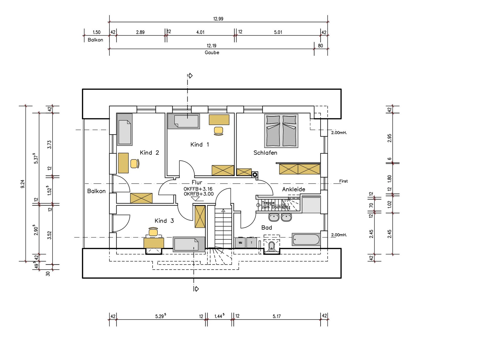 Ich würde so etwas planen.Ich sehe schon die Kinderzimmer mit offenem Dachstuhl und da oben ein cooles hochbett. 🙂 Da werden aus den 13qm gleich mehr als 20qm