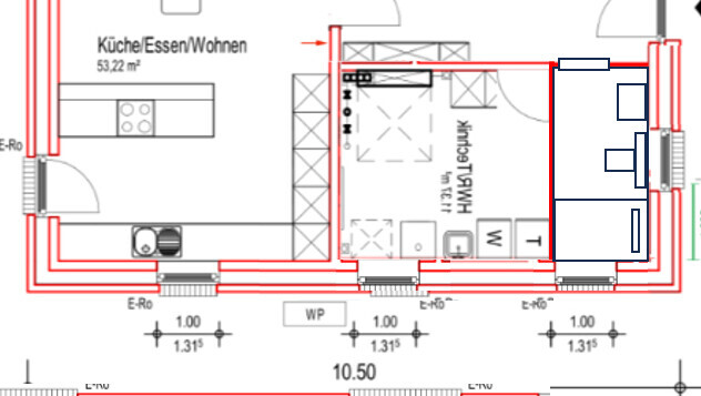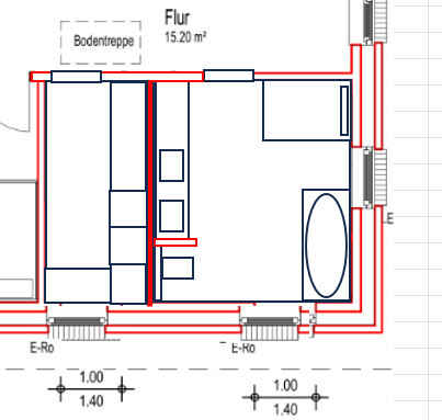 Grundriss eines Wohn- und Badezimmerbereichs mit roten Heizungsrohren entlang der Wände.