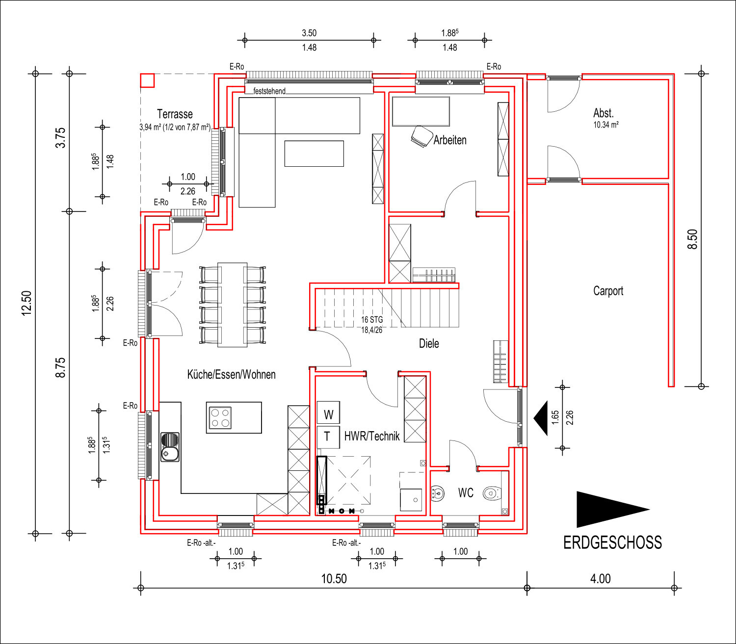 Esstisch sieht aus wie 70 cm breit, Terrassentüren als Flügeltüren behindern halt im Terrassenzugang. Denn planlinks soll ja sicherlich auch noch Terrasse hin. Kinder spielen im Garten usw. Aber mal unabhängig.