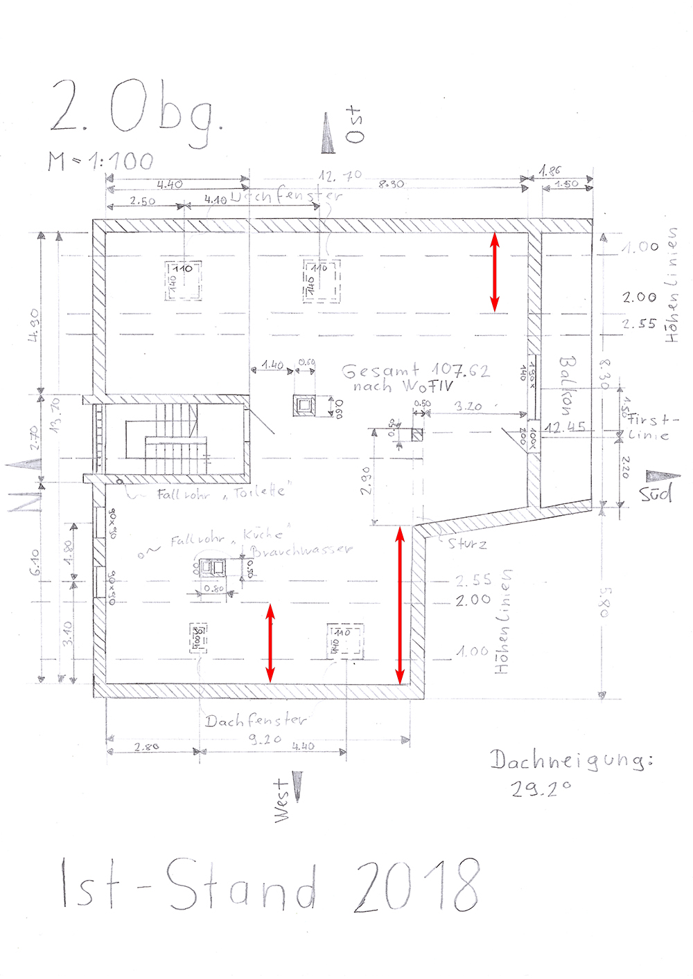 Ich habe nun meine Skizze um eine ausführlichere Bemaßung des Wände, Fenster, Höhenlinien und Dachschrägen ergänzt. Außerdem habe ich alle vier Himmelsrichtungen eingezeichnet.