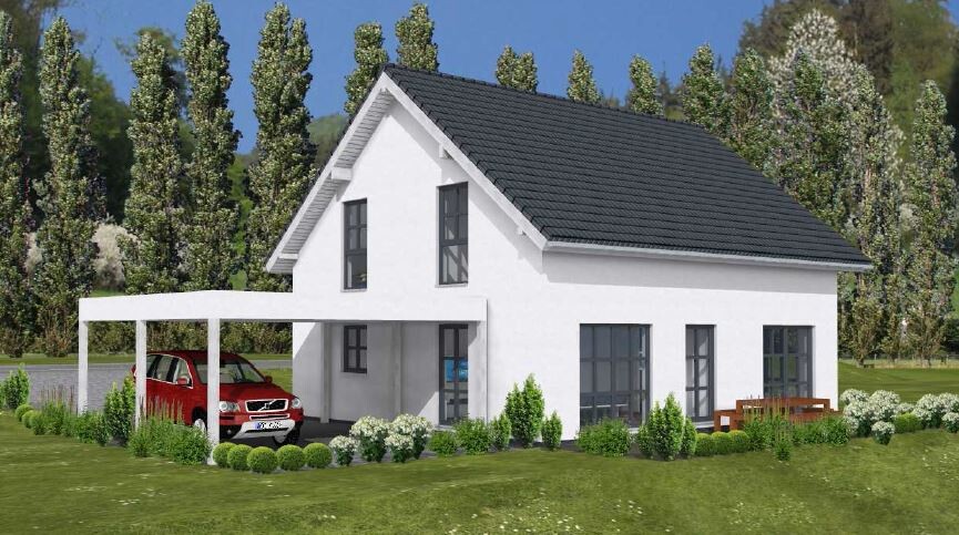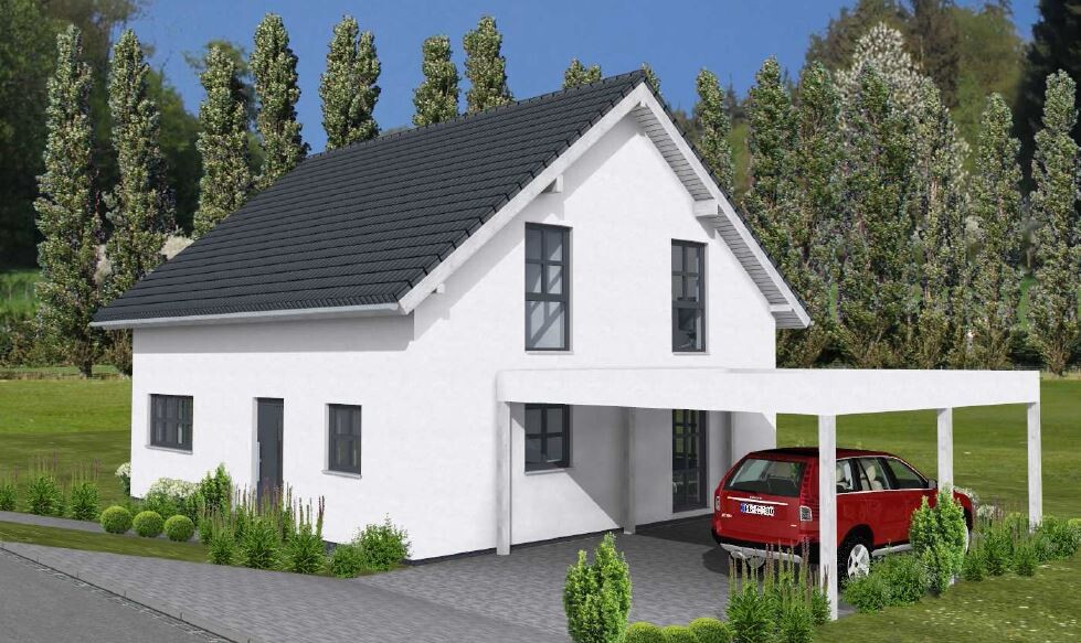 3D-Ansicht eines weissen Einfamilienhauses mit Carport und rotem Auto