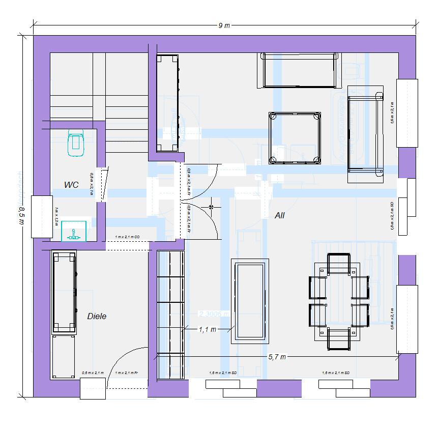 Allerdings weiss ich nicht ob ein 3 Meter Sofa in L-Form so noch optisch hinpassen würde. Haben wir so denn viel Platzugewinn zur Bauträgerlösung? Wenn ich mich nicht verrechnet habe circa +3 Quadratmeter. Dafür fehlt der Stauraum im Technikraum für z.B. Getränkekästen. Was meinst du?