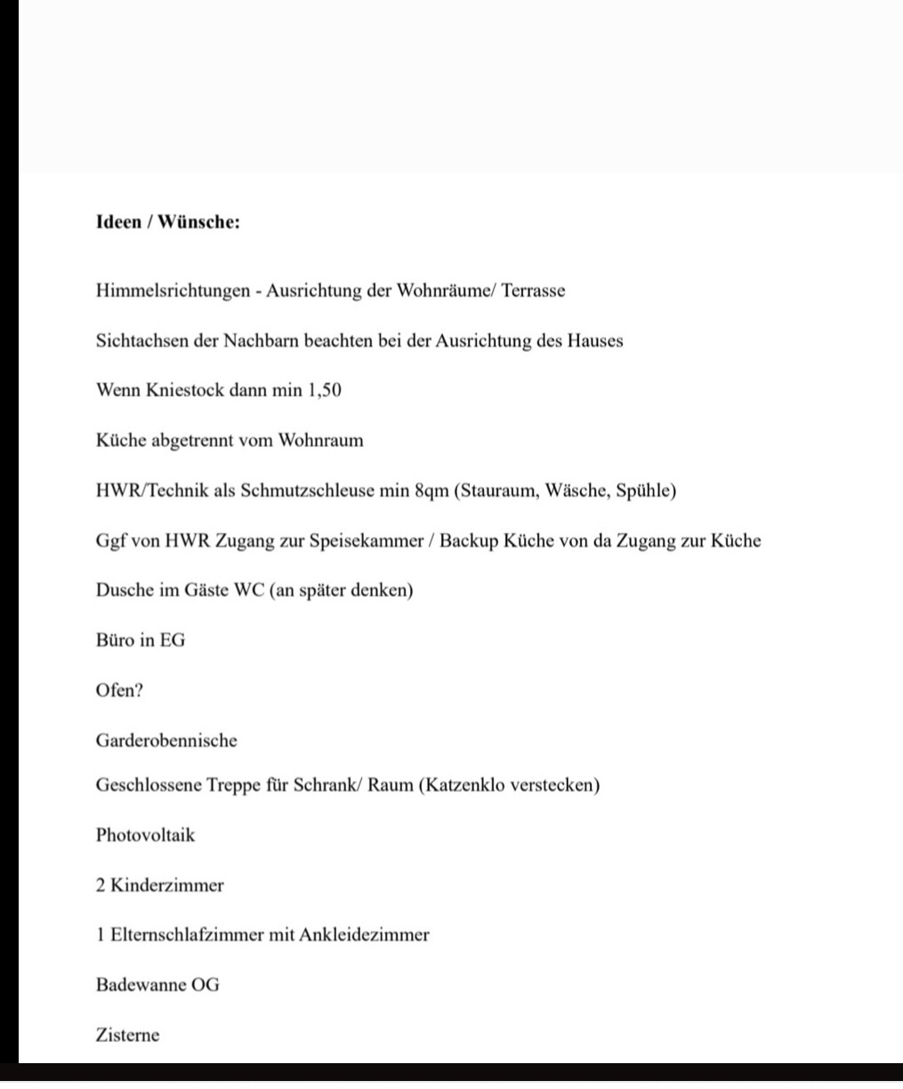 Ideen/Wünsche für Haus: Orientierung, Sichtachsen, Küche abgetrennt, HWR, Dusche, Büro, Photovoltaik.
