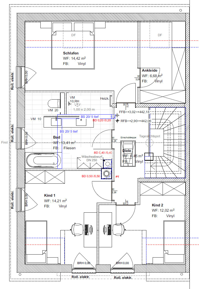 - Einplanung eines Wäscheabwurfschachts - dieser musste teilw. in das Kinderzimmer 1 und dadurch Verkleinerung des Kinderzimmer 2, nehmen wir aber in Kauf